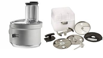 Powered by the attachment hub on KitchenAid stand mixers, Uses the ExactSlice™ System to allow easy slice thickness adjustment with a sliding lever Can slice, dice, shred, and julienne fruit, vegetables, and hard cheese; Includes a storage case to contain dicing kit and discs, Wide feed tube can accommodate various food sizes Includes: Food processor attachment, Slicing disc, Shredding disc, Julienne disc, Dicing disc and blade, Dicing disc cleaner, Storage case